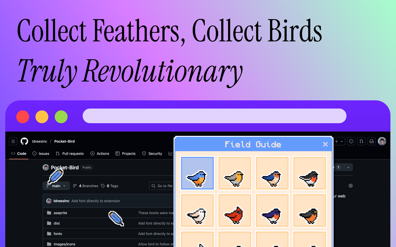 Feathers will occasionally fall from the top of your browser window. Clicking on a feather will add a new species to your field guide, allowing you to change the appearance of your pet!
