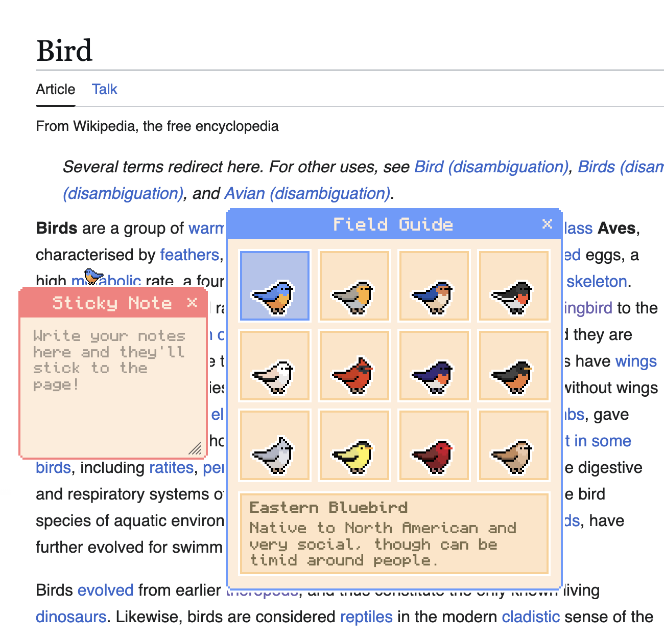 - A cute little pixel art bird hops around your webpages as you browse